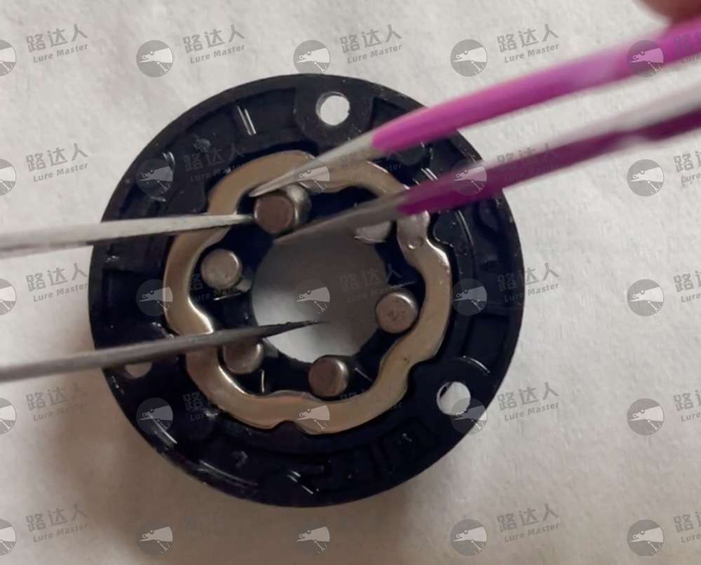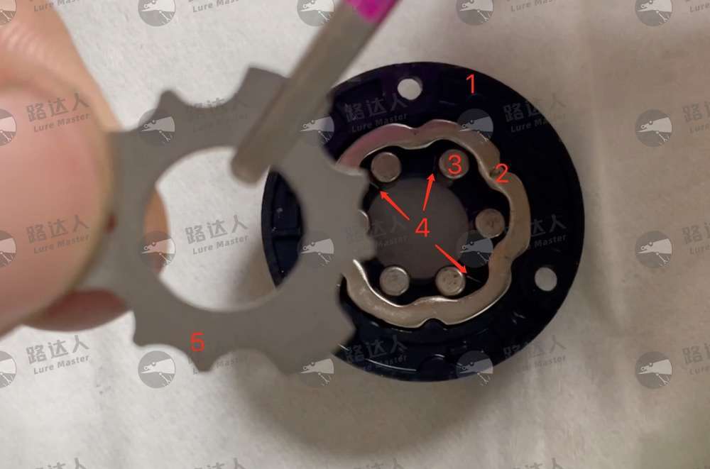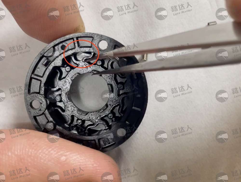 梅花護圈有一側有個點,另外一側沒有,將有點的一側朝上放到外圈塑料件,注意別把Z型彈簧搞亂了