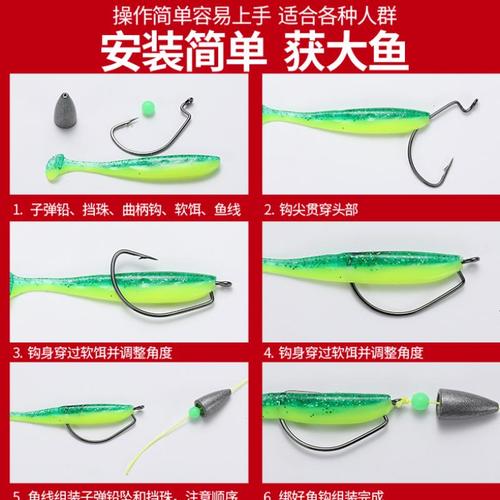 事實上,德州釣組非常容易組裝。德州釣組所需要的組件就是一個曲柄鉤、軟餌和中通的子彈銅(鎢),之所以不推薦使用鉛制品,主要是因為,鉛屬于重金屬,小小的一顆鉛看似不起眼,但由于掛底而遺留到水中的數量常年累計起來也是不容小視的環保問題,而鎢制品較其他兩種材質的又有點貴,所以,相對比較經濟環保的選擇還是推薦子彈銅。對于釣組所用的軟餌類型,推薦使用蛆型、蟲型、蜥蜴、自進蝦等。