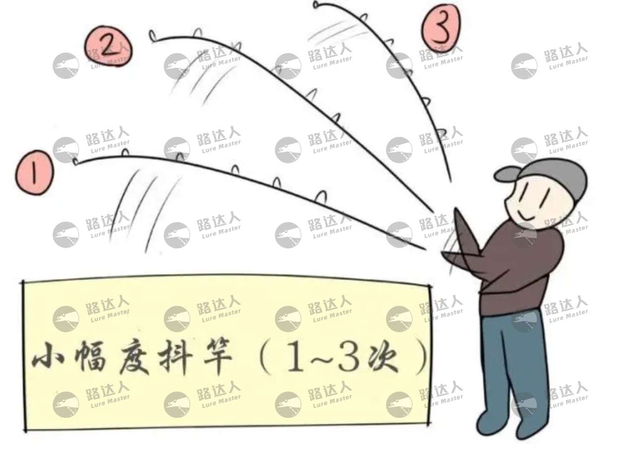 自由釣組必不可少的技巧之一。首先,小幅度向上抖竿1~3次,讓